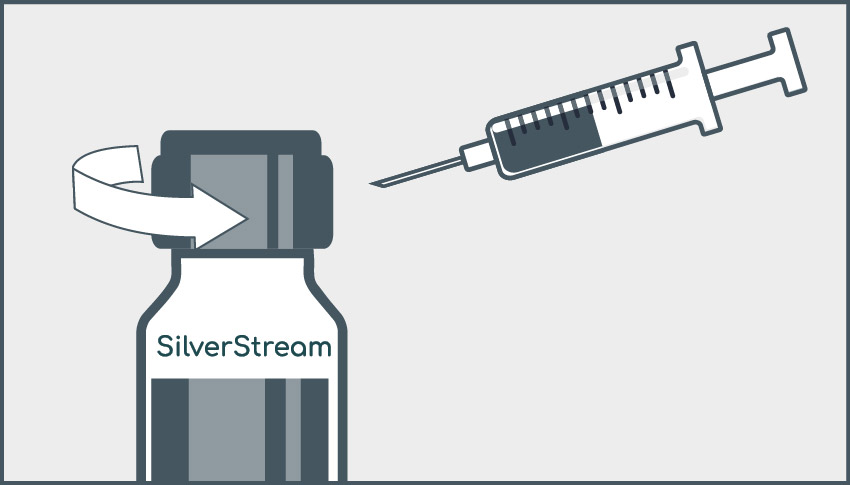 Buka tutup botol, masukkan syringe dengan jarum ke dalam botol, dan tarik larutan SilverStream sebanyak yang disarankan oleh Tenaga Medis.